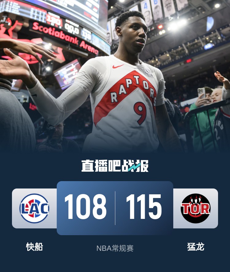开场后巴雷特上来就连得8分,随后奎克利和珀尔特尔也是内外开花,快船在哈登的带领下紧追不舍,哈登首节砍下12分,不过猛龙首节手感太过火热始终占据主动。第二节上来猛龙手感下降主要靠巴雷特和巴恩斯完成进攻,快船则是在小波特和曼恩的发挥下一度反超比分,随后两队陷入僵持,半场过后两队打成61平。易边再战,巴雷特和迪克联手帮助猛龙再次建立优势,在第三节后半段猛龙连续打出反击将分差拉大到两位数,虽然第四节快船努力追分,并且一度追到只差7分,但比赛时间所剩不多,快船无力回天,最终猛龙115-108击败快船。