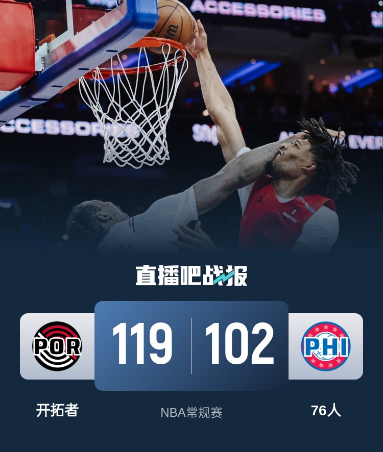 A-西蒙斯34分 马克西伤退 庄神25+18 开拓者力克76人