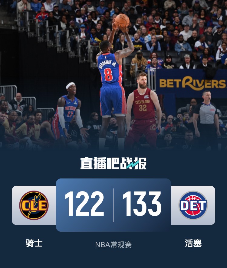一开场,双方很快陷入缠斗,比分咬得很紧,小哈达威连中三分高效输出,骑士内外开花给出回应,次节骑士轰出11-0的攻击波强势反超,活塞轮番冲击篮筐连投带罚稳住局势,半场战罢活塞63-58领先骑士。下半场,活塞大举进攻,小哈达威连中三分延续火力,骑士攻防两端表现不佳,分差一度拉开到20分以上,末节米切尔狂砍22分一度追到只差2分,但施罗德连得5分锁定胜局。最终,活塞133-122力克骑士,主场过关。