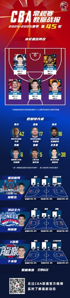 数据领先者方面:四川蓝鲸篮球俱乐部球员亨特以单场42分的数据领衔得分榜;