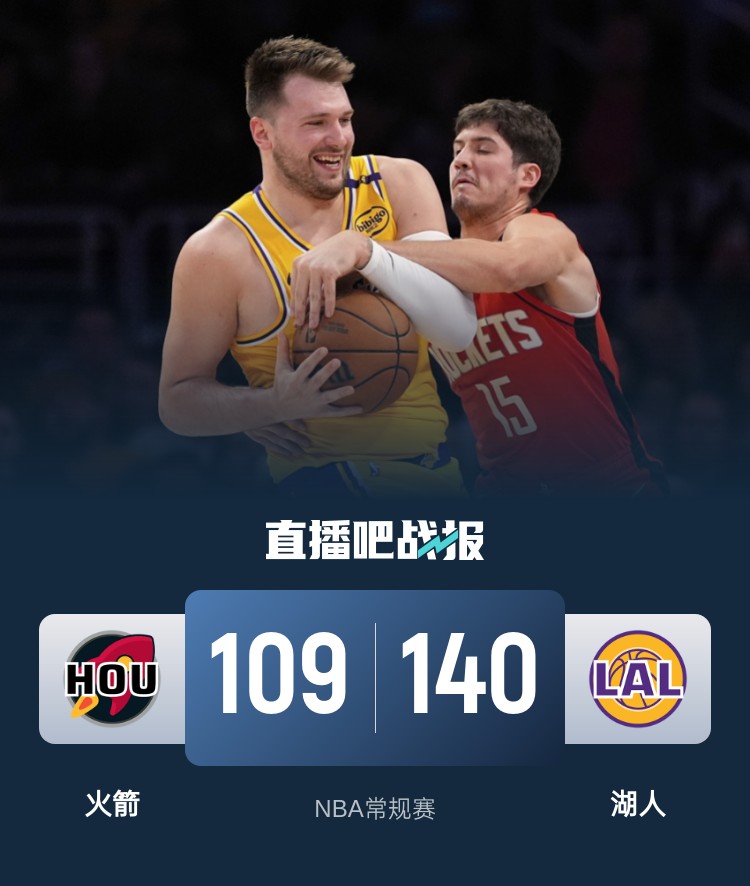 东契奇39+8+7 白魔生涯新高34分 湖人轻取残阵火箭锁西部第3