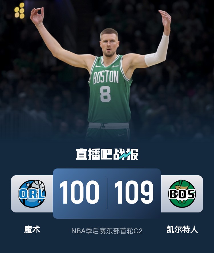 比赛开始,双方迅速进入状态,但随后加强防守命中率下降,魔术宁愿犯规也不放投三分,杰伦-布朗单节贡献12分,但比分胶着,首节绿军领先2分,次节波尔津吉斯接连内线强打带领绿军9-0一度领先到双位数,但小瓦格纳连续突破砍下7分强势回应咬住比分,小卡特里突外投也是连砍7分,半场魔术仅落后3分。下半场,绿军连续3记三分一波11-0领先到双位数,魔术回应9-2止血,绿军众将接连突破又是9-0,三节绿军还领先10分,末节班凯罗有攻有传带队继续追分,但怀特补篮加连续三分回应,绿军保持住10分左右领先,最终凯尔特人109-100力克魔术,总比分2-0领先。