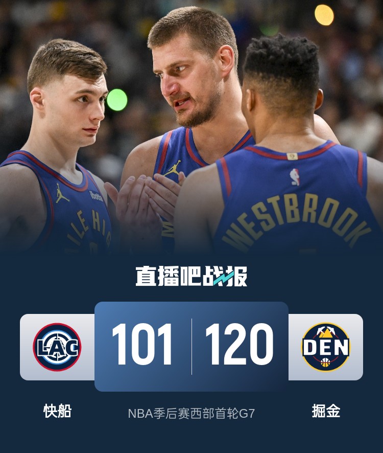 约基奇16+10+8 小卡22+5 哈登8中2 掘金6人上双抢七淘汰快船