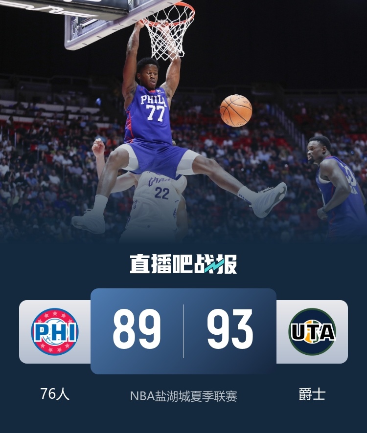 首节之争两支球队的关键球员埃奇库姆和贝利表现都还算不错,爵士在最后不到2分钟的时间里送上一波10-2的攻势抢占主动权;次节76人开局短暂扭转局势反超比分,但回头又被爵士轰出一波13-0的攻势,后者也依靠这波攻势取得9分领先进入下半场。休息归来爵士状态又一次回落导致分差不断被缩小;探花秀埃奇库姆攻防一体末段封盖加进球帮助76人反超比分,不过决胜时刻埃奇库姆关键罚球不中错失扳平机会,爵士也在随后连续罚丢罚篮给足机会,但76人都没能抓住。最终,爵士93-89惊险击败76人拿下比赛。