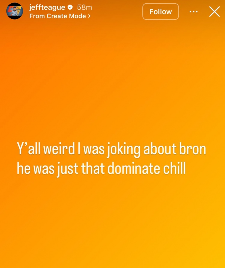 在此番言论引发争议后,蒂格更新Instagram Story澄清道:“你们好奇怪,我只是在开勒布朗的玩笑,他就是那么有统治力,你们冷静一下。”