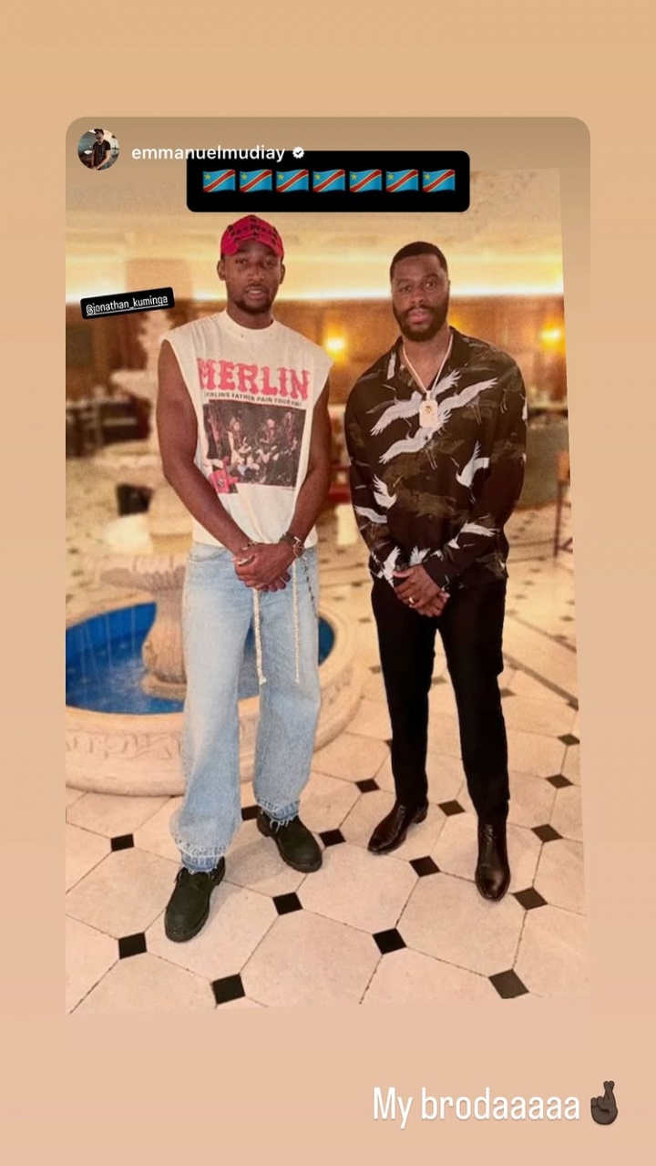 库明加今日更新动态,晒出了自己和同样在刚果(金)出生的穆迪埃的合影,并配文:我的兄弟。