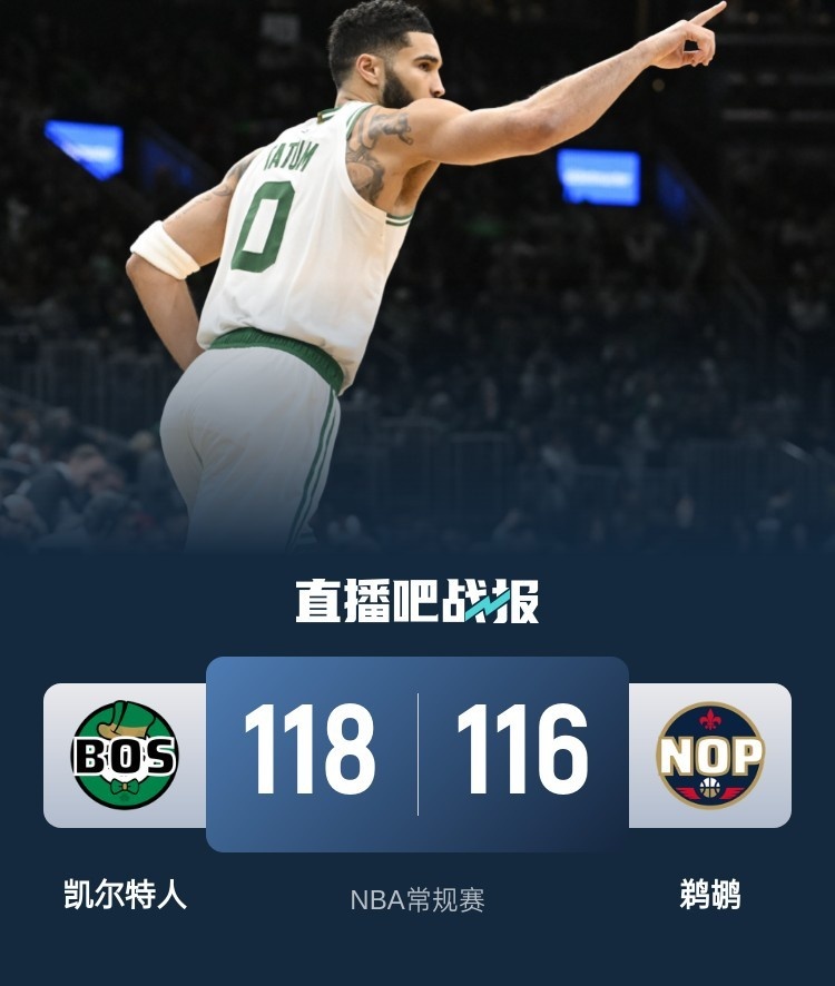 塔图姆27+10&绝杀 墨菲20中15&8记三分空砍40分 绿军险胜鹈鹕