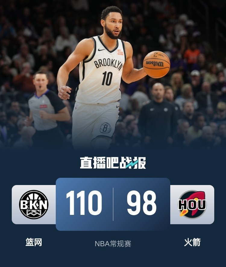 比赛开始,两队开场便陷入缠斗,比分交替领先,火箭内外开花,篮网连投带罚还以颜色,次节火箭命中率骤降,篮网不断冲击内线频频得手将分差拉开到两位数,半场战罢火箭38-53落后篮网。易边再战,篮网稳扎稳打将优势扩大到20分以上,末节火箭苦苦追赶缩小分差,但篮网连投带罚保持两位数领先,最终,火箭98-110不敌篮网,主场落败。