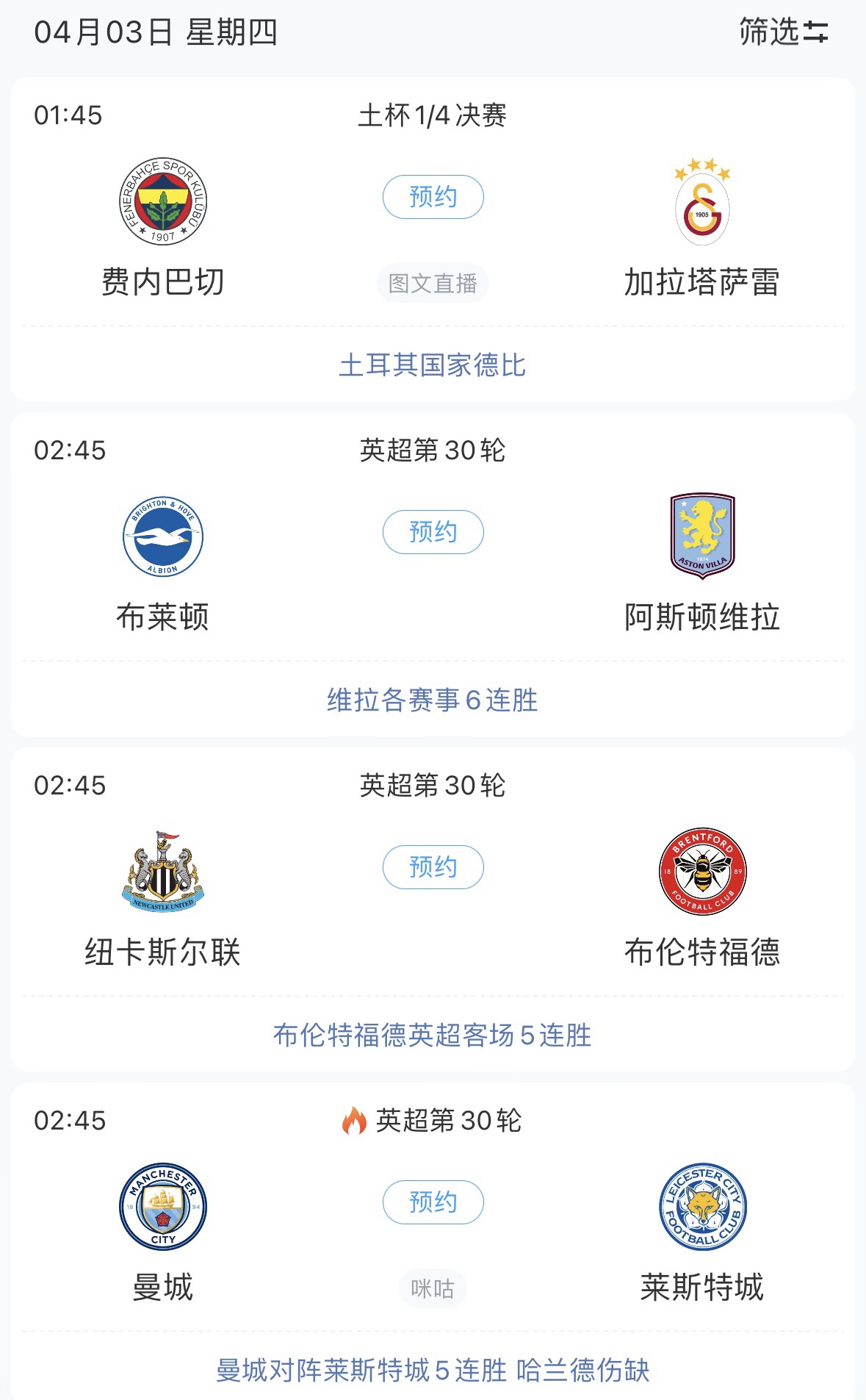 01:45 费内巴切vs加拉塔萨雷(土杯1/4决赛)