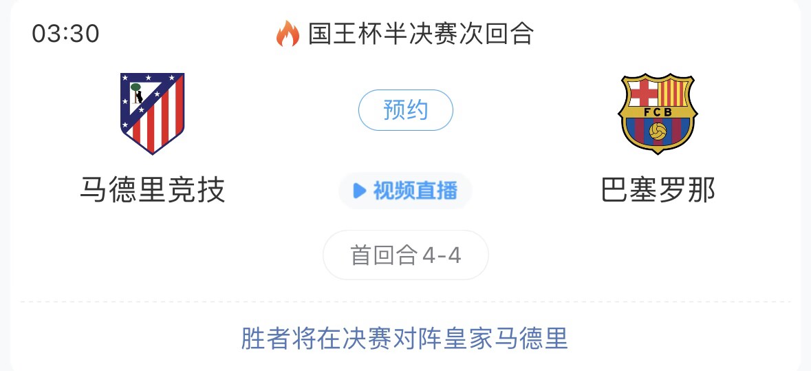 03:30 马竞vs巴萨(国王杯半决赛)