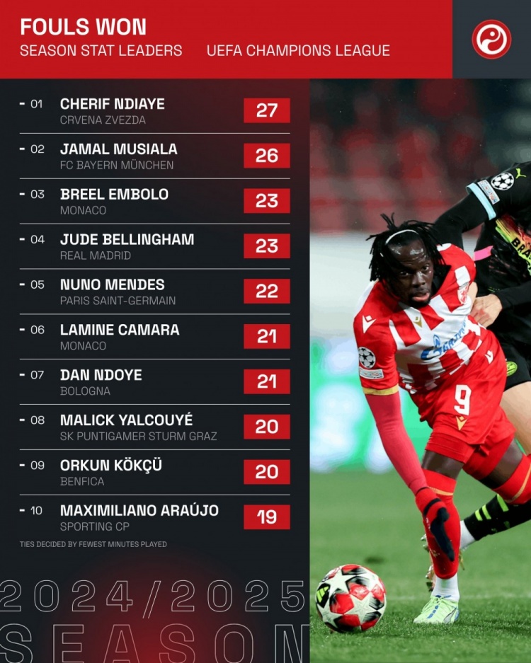 本赛季欧冠被犯规前十榜单:恩迪亚耶27次居首,穆西亚拉26次第二