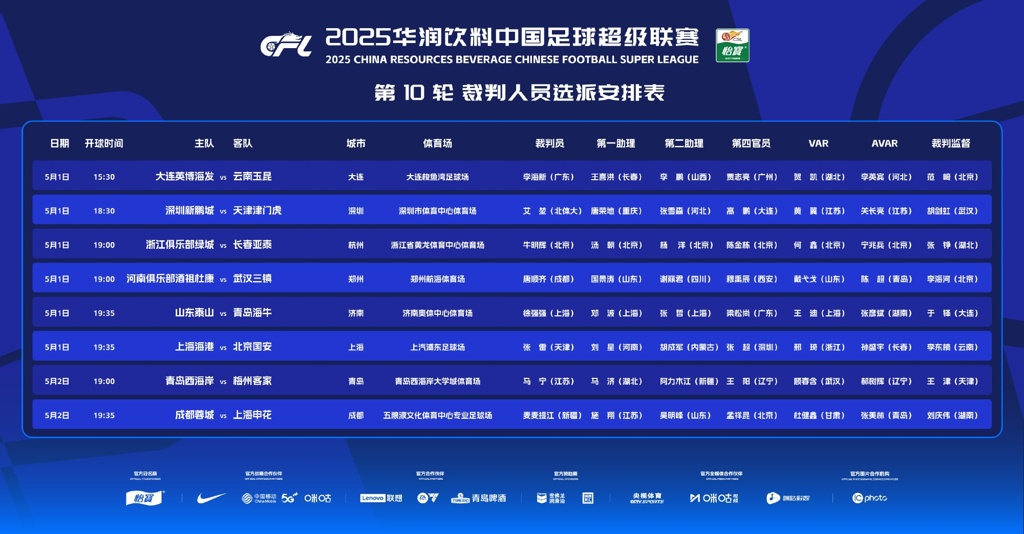 中超第10轮各场比赛裁判安排↓