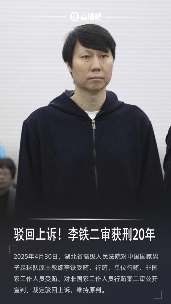 4月30日,湖北省高级人民法院对中国国家男子足球队原主教练李铁案二审公开宣判,裁定驳回上诉,维持原判。