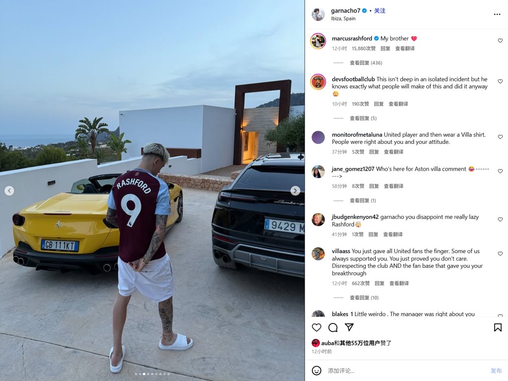 在加纳乔晒照之后不久,拉什福德现身评论区,回复:“我的兄弟❤️”