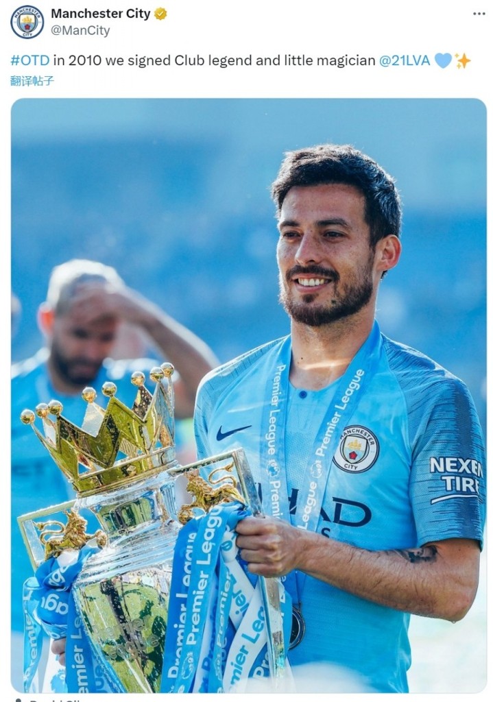 曼城官方社媒晒出大卫-席尔瓦与英超奖杯的合照,配文:“2010年的今天,我们签下了俱乐部传奇和小魔术师。”
