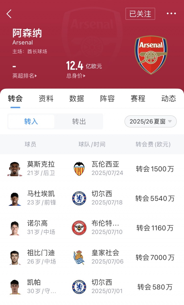 25/26赛季夏窗至今,阿森纳已花费1.578亿欧,引进5名新援凯帕、祖比门迪、诺尔高、马杜埃凯、莫斯克拉。如果算上未官宣的约克雷斯,阿森纳夏窗引援费用将突破2.2亿欧。