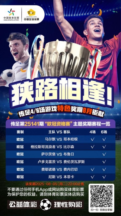 第25141期传足4/6场游戏特色奖期已经于2025年8月3日20:00开售,将于2025年8月5日22:00停售,并于8月7日开奖,其中马尔默VS哥本哈根、格拉斯哥流浪者VS比尔森、费耶诺德VS费内巴切和尼斯VS本菲卡为4场进球游戏竞猜赛事。