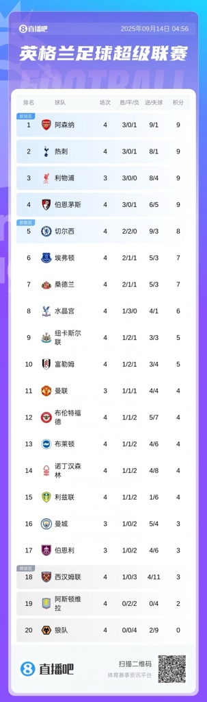 09月14日讯 英超第4轮,伯恩茅斯2-1击败布莱顿,豪取英超三连胜,升至积分榜第4位。