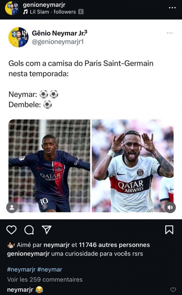如今,巴黎球迷自然翻出了这条推文,拿它来指责内马尔,目前内马尔效力于巴西的桑托斯,处境平平,毫无亮点,反观登贝莱,已然是金球奖得主。