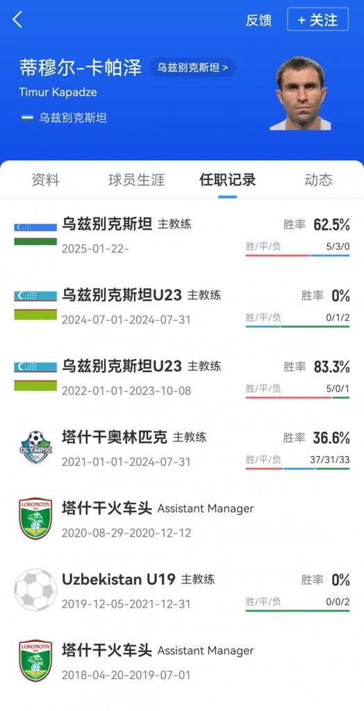 据乌兹别克斯坦媒体最新报道,自今年1月以来一直担任国家队主帅的卡帕泽的未来目前尚不清楚,有消息称他将在新的教练组中获得一个位置。