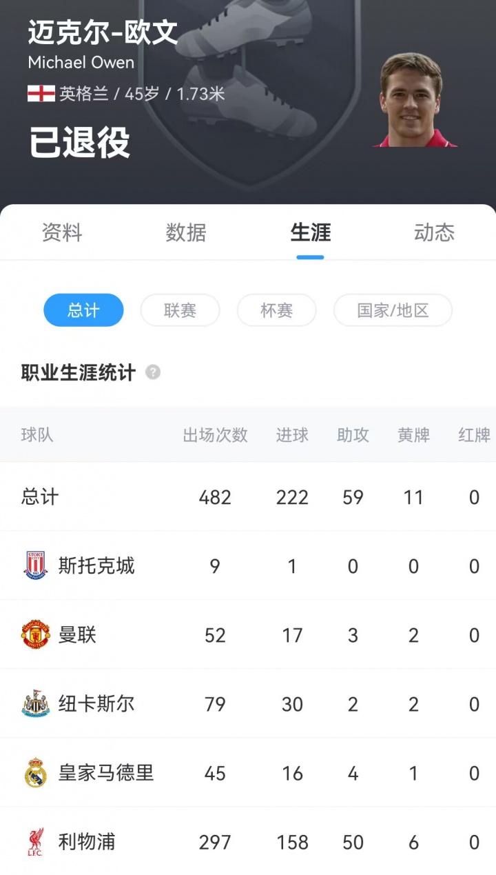 欧文出道于利物浦,曾连续获得97/98、98/99赛季英超金靴奖,2001年获得金球奖,但早早到来的伤病使欧文的职业生涯未能一直保持状态。他的职业生涯辗转于利物浦、皇马、纽卡、曼联等多支球队,最终在斯托克城退役。