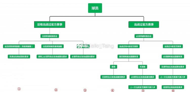 博主“Jallo_Tang”写道:由于他在24年4月代表澳洲U23出战亚青赛(此时他已经22岁零3个月),属于超龄(规则是21岁前),无法代表中国,即为图中路径5,这是现实情况。理论上,只能按照10.2a的规则,东大有关部门证明他在首战时已具备中国国籍联系,才能具备转换协会的资格,即为图中路径4。