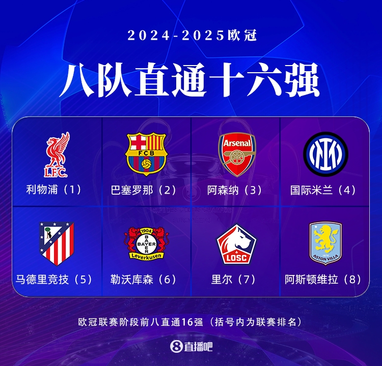 直通16强的8支球队:利物浦、巴塞罗那、阿森纳、国际米兰、马德里竞技、勒沃库森、里尔、阿斯顿维拉
