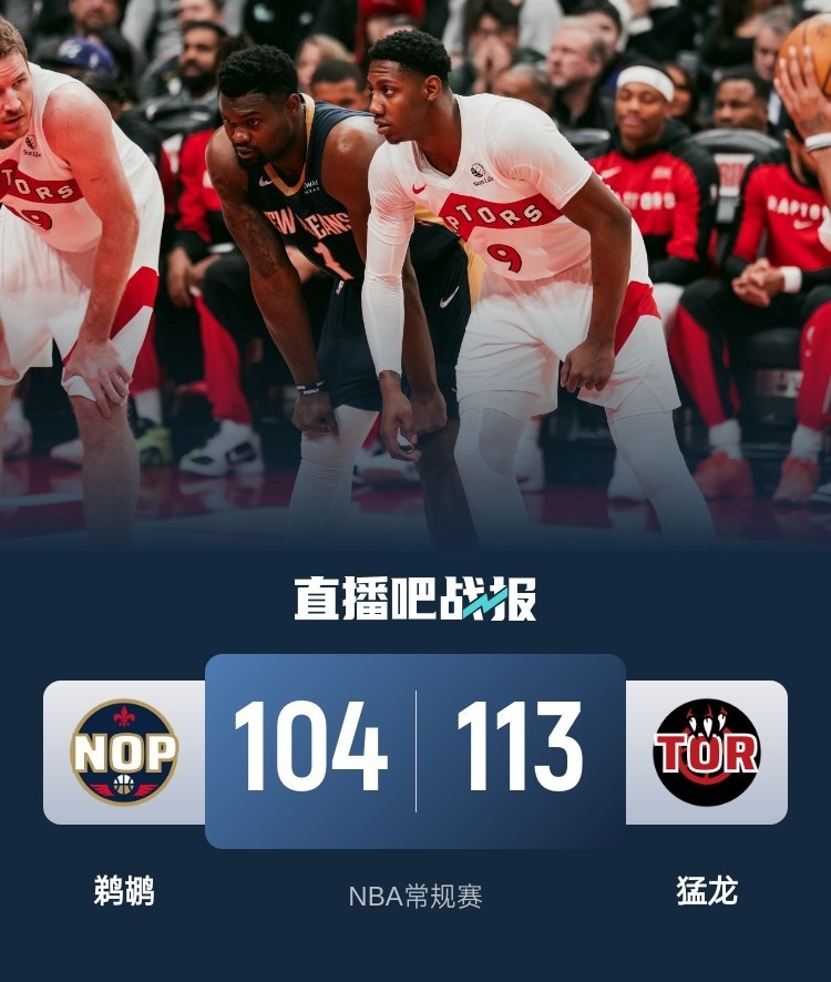 首节开打后双方互相试探,猛龙多点开花逐渐占优,锡安联手麦科勒姆及时回应,首节结束时猛龙领先5分,次节回来,锡安接连取分率队缩小分差,但猛龙延续火力,末段再度发力拉开比分,半场战罢,猛龙确立16分优势。易边再战后穆雷和麦科勒姆轮番打进,墨菲外线续上火力,鹈鹕连续轰出得分高潮一举反超,三节结束后鹈鹕反超1分,末节决战,鹈鹕进攻突然断电,猛龙轰出12-3攻击波确立优势,鹈鹕追分无望,最终猛龙113-104力克对手迎来4连胜,同时送给鹈鹕3连败。