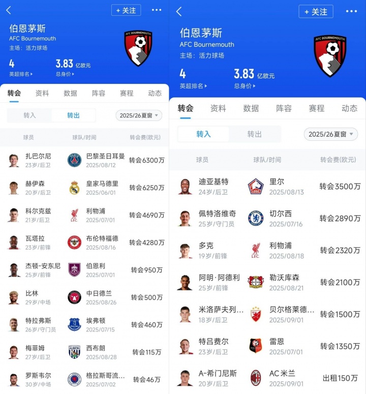 今夏伯恩茅斯把上赛季的后防线几乎全拆了,收入2.3841亿欧,净赚1.0031亿欧,净赚数额英超第1&全欧第2(摩纳哥第1)。